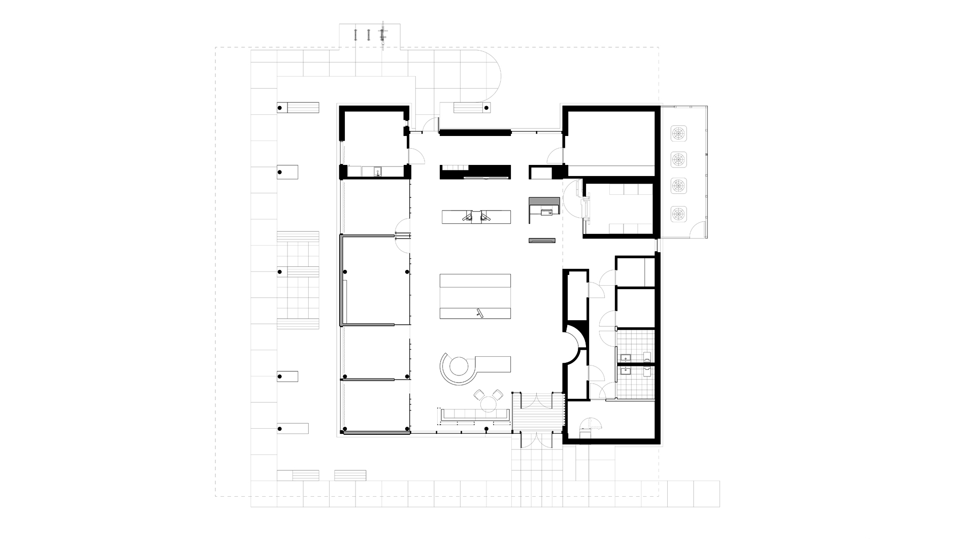 The new concept for a site in Hudson Oaks is a ground-up single story building with a large oversized roof that spans across the building and mediates sun on the south and east exposures. The roof size and position was designed to block east and southeastern sun and allows for large areas of clear glazing and direct views into the space. The utilities are housed in a faced-concrete block mass positioned on the west side to block afternoon and evening sun, but a clerestory—concealed under the roof span—allows daylight to indirectly enter. The block mass has a L-shape with a large opening on the backside to allow for sight lines through the whole building on the central axis. While seemingly very transparent, the design features block or mediate all direct sun while taking advantage of indirect daylight to minimize lighting needs during daytime hours. After-hours the building illuminates and glows like a beacon with the internal lighting bouncing off the slight bluish underside of the large roof canopy.